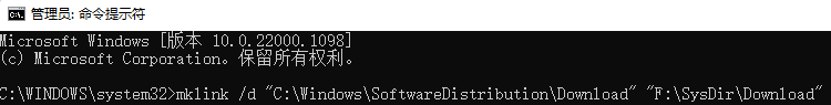 若文件夹路径中有空格,需在路径两边加上英文引号,如mklink /d "C:\Windows\SoftwareDistribution\Download" "F:\SysDir\Download"