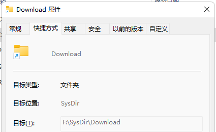 若以普通的快捷方式指向F:\SysDir\Download,打开快捷方式后,地址栏将显示 F:\SysDir\Download