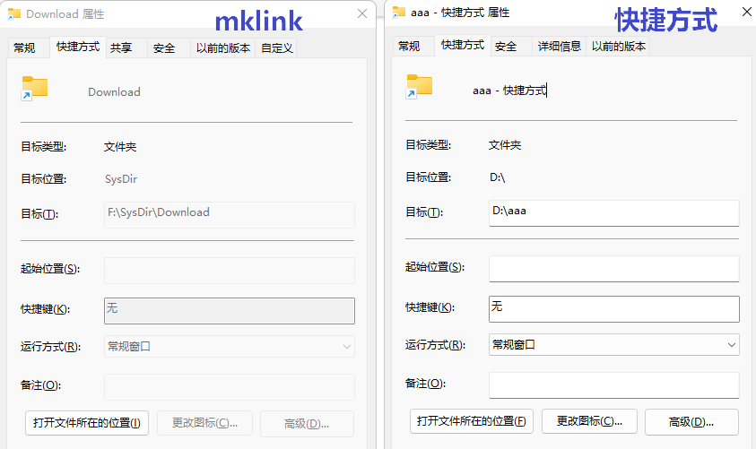 打开快捷方式,地址栏显示的是目标路径,而打开mklink创建的链接文件夹,地址栏中显示的是链接文件夹的路径,从这一点就可以看出mklink和快捷方式的不同。