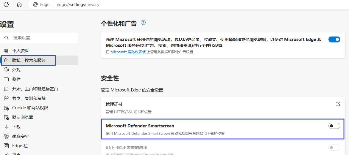 2. 在【隐私、搜索和服务】中找到(或搜索smart)并关闭Micsoft Defender Smartscreen